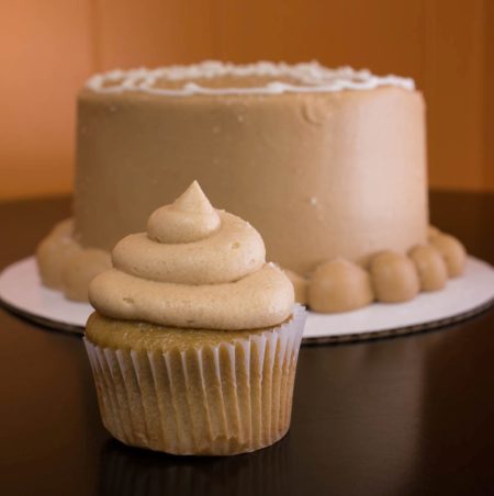 A brown sugar cake with a salted caramel buttercream frosting that includes way more caramel (made by me from scratch) than any recipe calls for. Introduced this past winter, this may now be our most popular cupcake. The salted caramel 12″ round and sheet cake are $10 more than usual because of the large quantity of homemade caramel required to frost such a big cake!